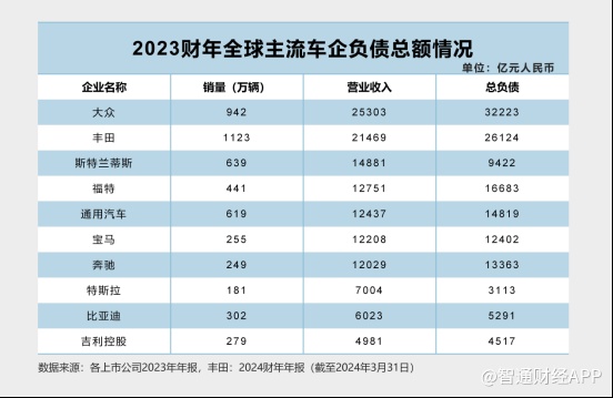 此外,全球车企债务总额也很高。按照最近一个完整财务年度数据,债务总额超过万亿元的车企有大众、丰田、通用、福特、宝马和奔驰,其中大众超过3万亿元,丰田超过2万亿元,远超比亚迪和吉利这两家头部车企。