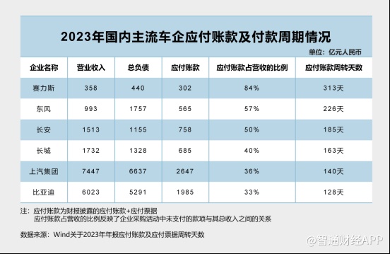 另外,一家车企的账期相对较短,意味着其供应商能够更快回款,减轻供应商的资金压力,增强供应链稳定性。数据显示,2023年比亚迪的应付账款转换天数为128天,上汽为140天,长城汽车为163天,长安汽车为185天,东风集团股份为226天,赛力斯为313天。