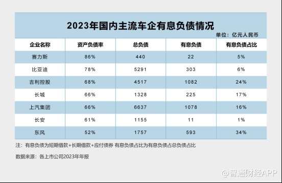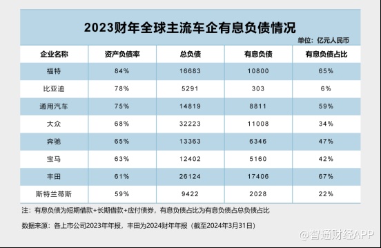 从有息负债占总负债的比例来看,海外车企的有息负债占比普遍较高,丰田和福特都超过60%,通用汽车也高达59%。