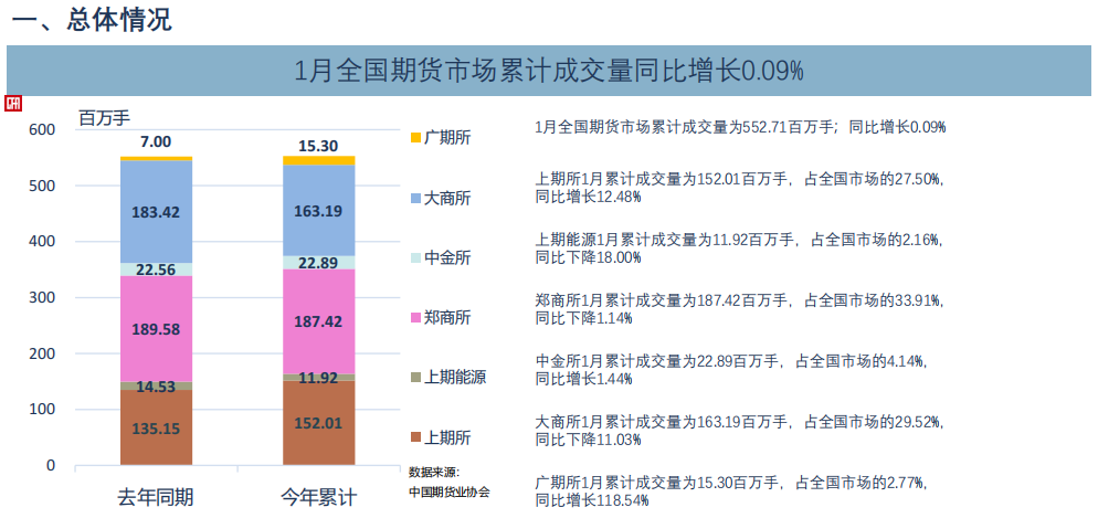 上海期货交易所1月成交量为152,006,364手,成交额为137,124.43亿元,分别占全国市场的27.5%和28.06%,同比分别增长12.48%和31.46%。1月末上海期货交易所持仓总量为8,476,249手,较上月末下降6.01%。