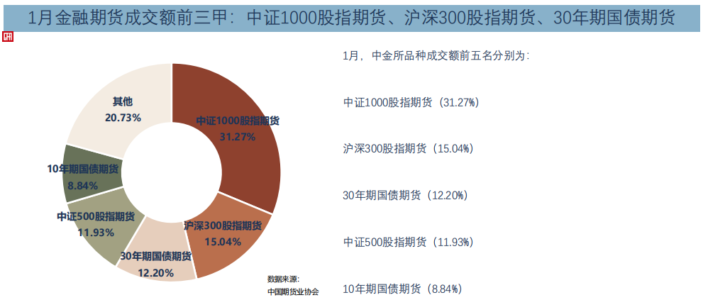 中国金融期货交易所1月成交量为22,888,194手,成交额为185,549.04亿元,分别占全国市场的4.14%和37.97%,同比分别增长1.44%和23.9%。1月末中国金融期货交易所持仓总量为1,957,991手,较上月末下降0.6%。