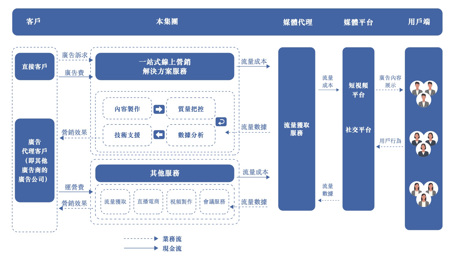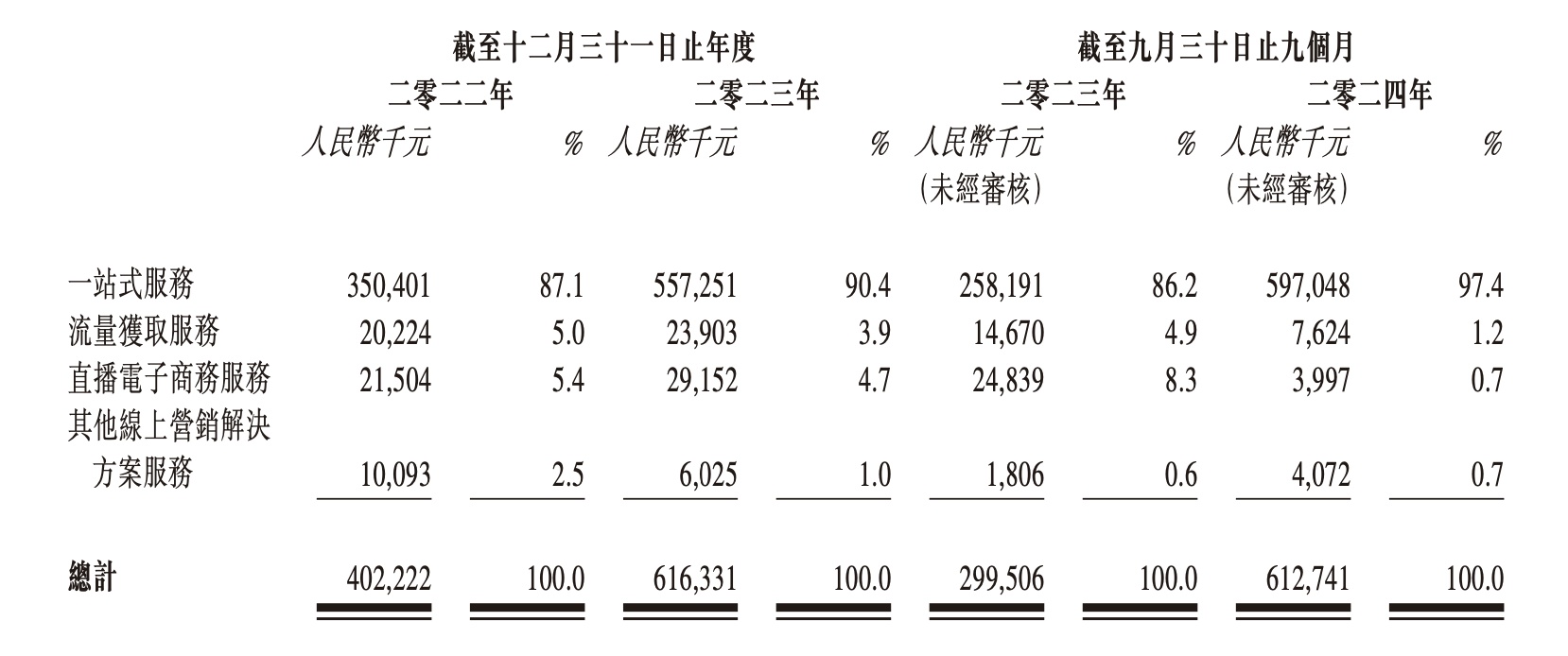其中,一站式服务为公司的主打业务。具体来看,公司透过媒体代理为各行各业的企业提供综合及跨平台的线上营销解决方案。公司以线上媒体平台作为策略重点,负责设计、推出、监控及优化该等企业的营销活动。2022年、2023年及2024年首9个月(简称“报告期内”),从一站式服务获得的收入分别约为3.50亿元、5.57亿元及5.97亿元,收入占比分别为71.4%、68.7%及88.7%,呈波动上行趋势。
