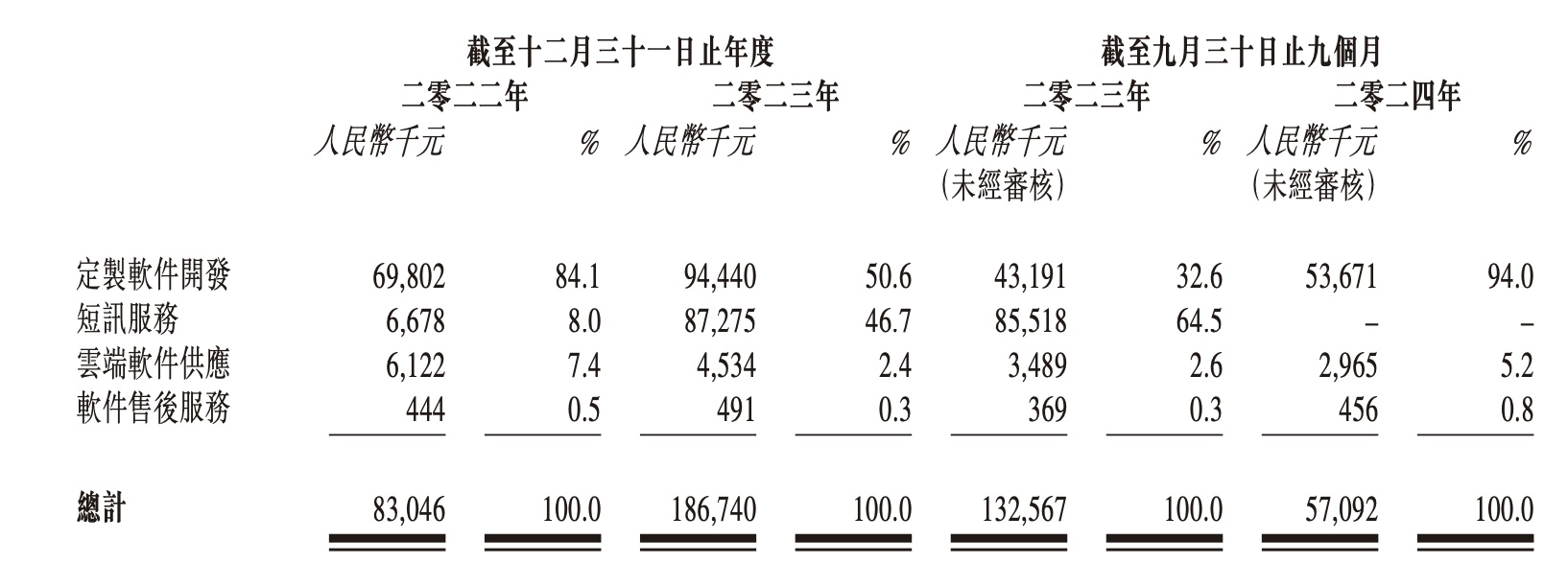 与此同时,公司的SaaS服务也呈现波动下行趋势。智通财经APP注意到,公司向企业客户(尤其是中小企业)同时提供量身定制及标准化SaaS服务,丰富其围绕数字通讯及媒体的营运方式。具体来看,公司提供的服务范围主要包括定制软件开发、短讯服务、云端软件产品 及软件售后服务。报告期内,公司从SaaS服务获得的收入分别约为8300万元、1.87亿元及5710万元,分别占同期总收入的16.9%、23.1%及8.5%。
