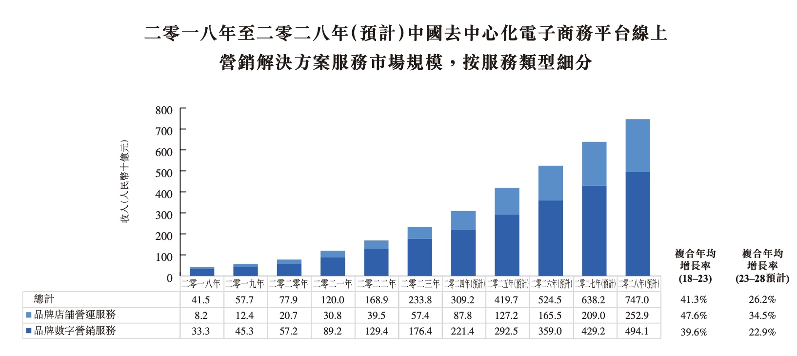 近年来,随着中国去中心化电子商务快速发展,越来越多企业开始利用数字化渠道开展有效营销及销售活动。企业对去中心化电子商务平台的需求为线上营销解决方案服务供应商创造广阔市场。市场规模从2018年的415亿元增至2023年的2338亿元,复合年均增长率为 41.3%。据弗若斯特沙利文预测,市场有望保持快速增长,到2028年将达到7470亿元,预计期间复合年均增长率将达到26.2%,增速有所放缓。