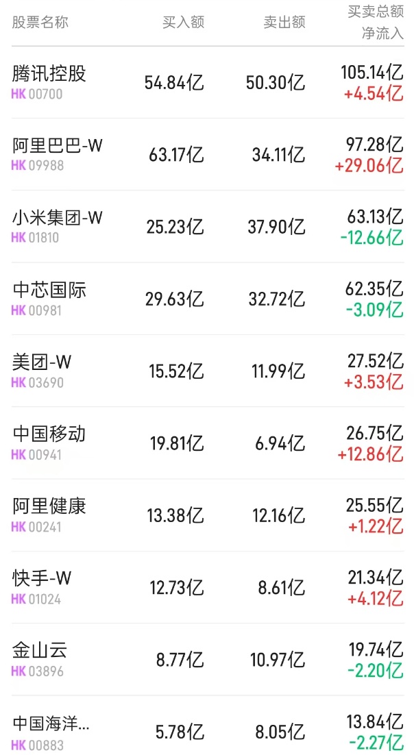 北水净买入最多的个股是阿里巴巴-W(09988)、腾讯(00700)、中国移动(00941)。北水净卖出最多的个股是中芯国际(00981)、中海油(00883)。