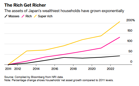 根据NRI周四发布的报告,2011年至2023年,日本富裕阶层和超级富豪的财富分别增长了一倍和两倍以上,而占日本家庭总数约80%的普通民众的资产仅增长了42.2%。