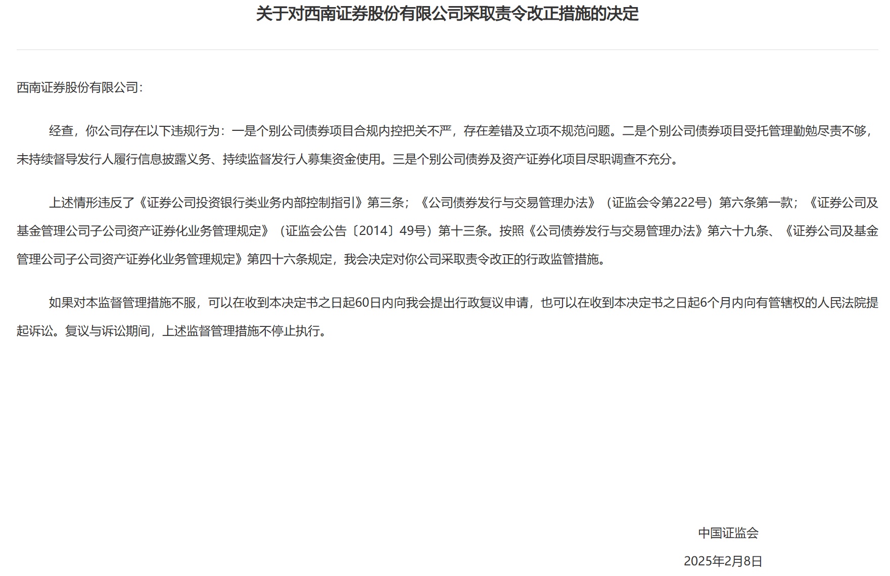 上述情形违反了《证券公司投资银行类业务内部控制指引》第三条;《公司债券发行与交易管理办法》(证监会令第222号)第六条第一款;《证券公司及基金管理公司子公司资产证券化业务管理规定》(证监会公告〔2014〕49号)第十三条。按照《公司债券发行与交易管理办法》第六十九条、《证券公司及基金管理公司子公司资产证券化业务管理规定》第四十六条规定,证监会决定对西南证券采取责令改正的行政监管措施。