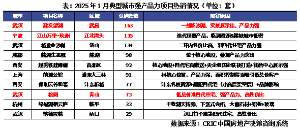 市场热度企稳回升与改善盘热销密不可分,产品力起到了关键作用,尤其是四代宅在多个核心一二线城市逐步落地,基本也成为区域销量王者。下表我们罗列了1月部分热销的产品力较强的热销项目,多为临湖、低密住宅,部分项目凭借得房率的提升和功能空间的逐步完善而实现热销。