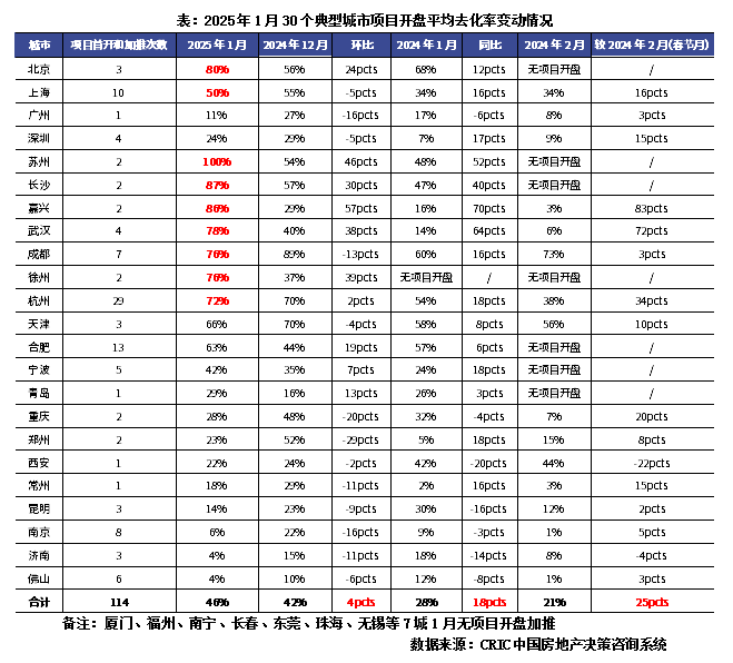 纵观2023年以来30个典型城市月度平均去化率变动情况,基本呈现“先抑后扬”特征,以2024年2月为转折点,开始企稳回升,尤其是1月以来虽然新房成交环比回落,但市场热度有增无减,去化率增至阶段性高位:据CRIC监测数据,2025年1月30城项目平均去化率仅为46%,环比上涨4个百分点,同比上涨18个百分点,与2023年以来波峰持平。