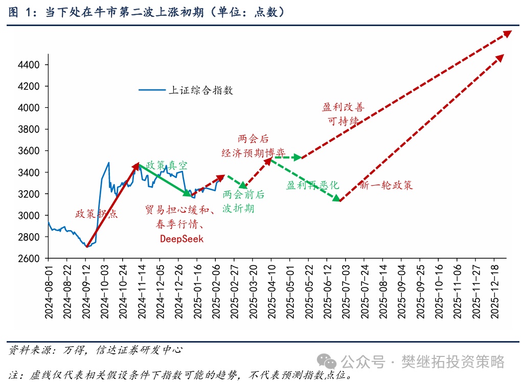 (1)牛市第二波节奏推演。我们认为,始于春节前的上涨,有很大的概率发展成牛市第二波上涨,现在还处在刚刚起步阶段。我们认为,随着资金、盈利状态和板块结构的变化,这一波上涨大概会分为三个阶段。第一个阶段是1月中旬以来,恰好是春节前后,我们认为季节性的资金回流、数据利空的空窗期、DeepSeek横空出世等因素是驱动上涨的主要原因,资金状态更多表现为交易性资金和海外资金的回流,板块表现比较分化,集中在AI相关的TMT。第二个阶段可能是两会后到4月中,此时市场的关注点将会是居民资金回流、开春后的经济数据、一季报,此时板块表现可能会比较均衡,博弈性资金可能会做补涨板块,价值型资金可能会基于高频盈利数据布局。第三个阶段是5月以后,此时更重要的将会是验证2-4月所有乐观变化的持续性,盈利层面如果有年度改善的逻辑,或居民资金流入的速度开始再次大幅加快,则牛市高度有望进一步展开。