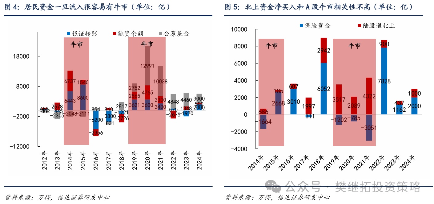 (3)4月决断:取决于国内居民资金或盈利二者之一能否有爆发性表现。Q2开始季节性的影响减弱,基本面的影响重要性上升。如果是盈利驱动的牛市,重点是验证经济恢复和盈利兑现。而如果是资金驱动的牛市,重点是观察居民资金流入强度。近期投资者观察到港股走强,这说明去年10月中旬以来海外机构投资者减仓的过程已经结束,可以驱动港股月底或季度的上涨。但如果想要继续发展为更持久的牛市,需要观察到居民资金流入。因为历史上,外资对A股牛熊市的影响是次要矛盾,居民资金的流入流出和牛熊市更相关。