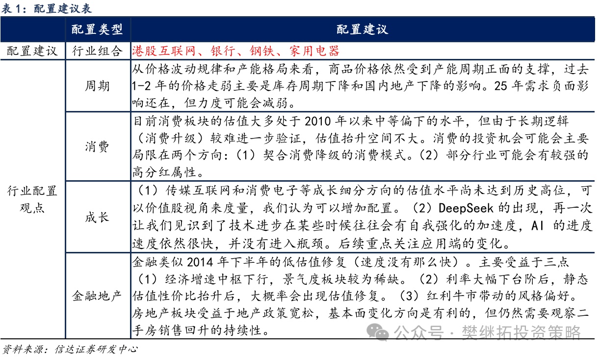 未来1个月配置建议:港股互联网(海外波动加大,中国资产配置意愿上升)> 出海(长期逻辑好,短期美国贸易政策影响低于预期) > 金融地产(等待验证春节后地产数据)。2024年10月以来的震荡期,市场风格偏向小盘低价策略,这种现象的一种解释是,流动性充裕但盈利较弱,所以投资者偏向博弈性风格。其实如果观察历次牛市(2005-2007、2014-2015、2019-2021),不管是否是盈利驱动的牛市,低价策略都容易在指数大幅上涨的后期至震荡初期有较强的超额收益。而一旦市场进入震荡期后期,低价策略大多会失效,指数新一轮中枢回升,大多不是由低价策略带动的。对于大小盘风格来看,牛市期间的每一次震荡,大概率是大小盘风格转变的拐点,震荡结束后,新的上涨波段大概率大小盘风格和之前不同。比如2020年7-9月震荡期之前的4-7月,市场风格偏小盘,但2020年8月-2021年初,风格转向大盘。2014年14-15年1月震荡期之前的9-12月,市场风格偏大盘,之后的2015年1-6月,风格转向小盘。站在当下来看,我们认为市场震荡末期,在新一轮上涨之前,大概率会提前观察到风格转向大盘。建议成长内部转配港股互联网,价值内部关注指数权重(银行)、破净类价值股(钢铁)。