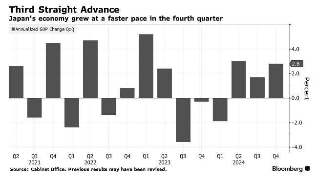 日本内阁府周一公布的数据显示,去年第四季度国内生产总值(GDP)环比年化增长率为2.8%,高于前一季度修正后的1.7%,也远超市场普遍预期的1.1%。
