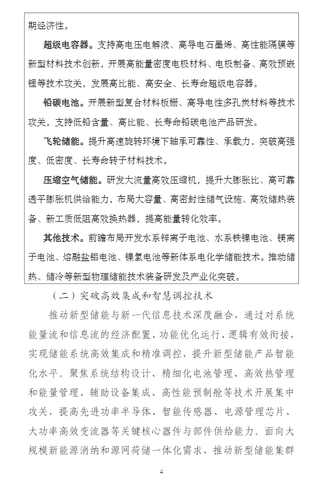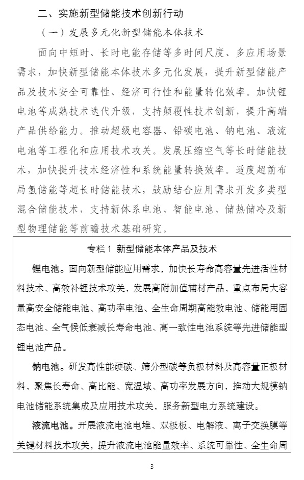 智通财经APP获悉,2月17日,工业和信息化部等八部门发布关于印发《新型储能制造业高质量发展行动方案》的通知。方案中提到,面向中短时、长时电能存储等多时间尺度、多应用场景需求,加快新型储能本体技术多元化发展,提升新型储能产品及技术安全可靠性、经济可行性和能量转化效率。加快锂电池等成熟技术迭代升级,支持颠覆性技术创新,提升高端产品供给能力。推动超级电容器、铅碳电池、钠电池、液流电池等工程化和应用技术攻关。