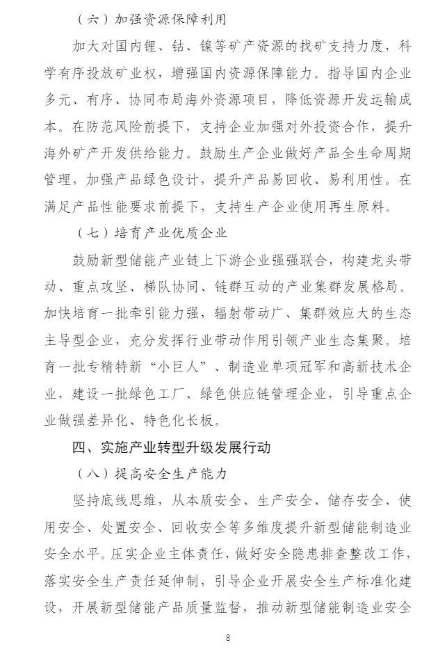 方案中提到,加大对国内锂、钴、镍等矿产资源的找矿支持力度,科学有序投放矿业权,增强国内资源保障能力。指导国内企业多元、有序、协同布局海外资源项目,降低资源开发运输成本。在防范风险前提下,支持企业加强对外投资合作,提升海外矿产开发供给能力。鼓励生产企业做好产品全生命周期管理,加强产品绿色设计,提升产品易回收、易利用性。在满足产品性能要求前提下,支持生产企业使用再生原料。