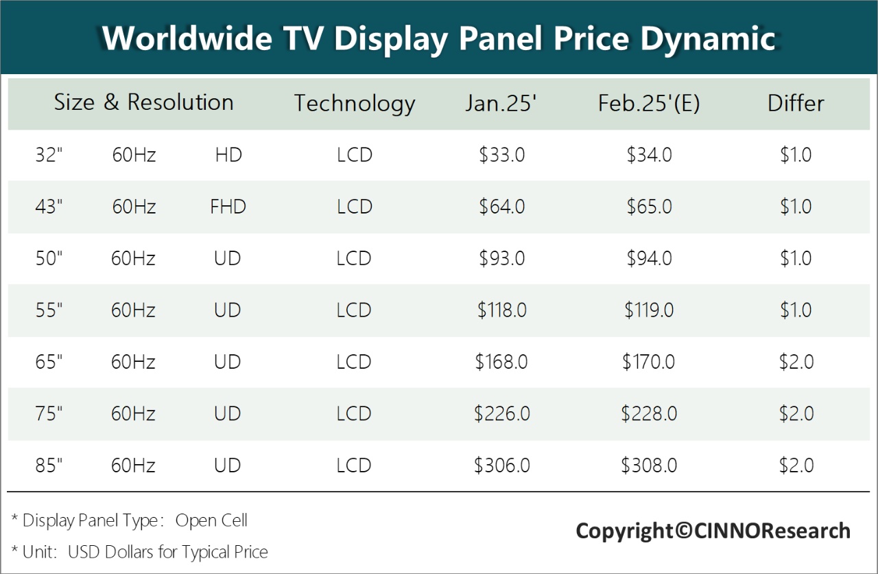 智通财经APP获悉,CINNO Research发文称,进入2025年一季度,春节期间虽为传统淡季,但国内“以旧换新”补贴政策的延续为新一年的家电市场注入了一剂“强心针”,TV市场需求短期内依旧强劲,促使1月65”及以上大尺寸面板价格持续上涨。进入今年2月,美国关税政策的落地以及推迟或将加速部分品牌厂后续的备货计划。在国内外备货需求高涨的情况下,面板厂虽小幅提升LCD TV高世代产线稼动率,但供应仍然偏紧,在大尺寸持续上涨的前提下有望拉动中小尺寸面板价格联动上涨。
