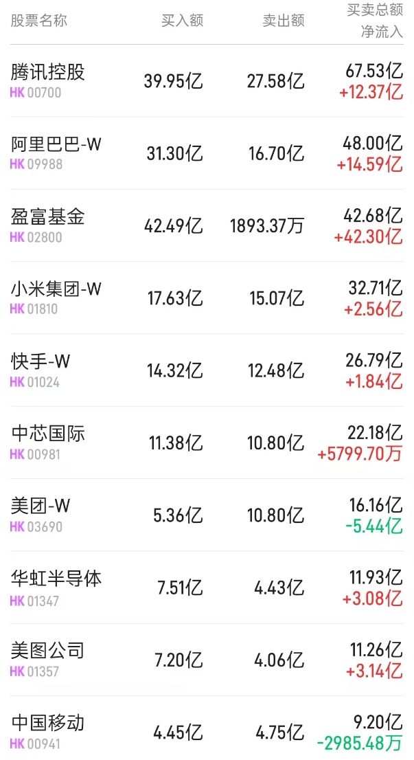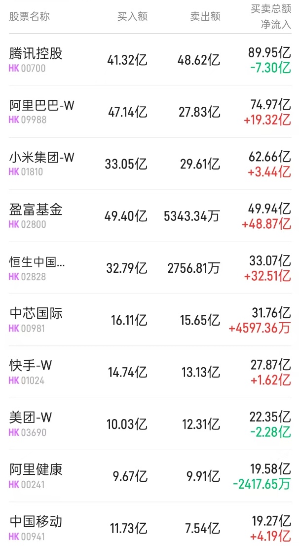 此外,小米集团-W(01810)获净买入5.99亿港元,而阿里健康(00241)遭净卖出2417万港元。