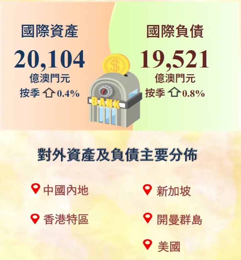 智通财经APP获悉,澳门金融管理局今日发布的统计显示,至2024年12月底,澳门银行的国际资产及负债总额均环比上升,国际资产为20104亿澳门元,按季上升 0.4%;国际负债为19521亿澳门元,按季上升 0.8%。对外业务主要分布在亚洲地区,包括中国内地及香港、新加坡、开曼群岛等。