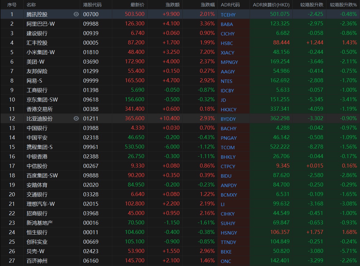大型蓝筹股多数下跌,汇丰控股收报88.444港元,较香港收市涨1.43%;腾讯控股收报501.075港元,较香港收市跌0.48%。