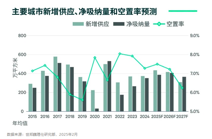 2025年中国房地产市场展望》报告。CBRE预计2025年优质零售物业市场需求将延续回暖趋势,8个主要一二线城市净吸纳量同比增长10%,由于同期内新增供应增速更快为16%,空置率将在2025年末小幅攀升。但市场新增供应在迈过2025年小高峰后将逐年递减,空置率也将快速回落。