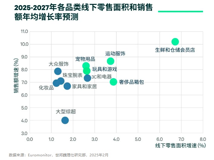 情绪价值和品质消费的兴起将为零售物业租赁市场积蓄新的增长动能。Euromonitor预测显示,未来三年销售额和面积年均增速领先的业态集中在生鲜和仓储会员店、运动服饰、宠物用品、玩具游戏和奢侈品箱包。