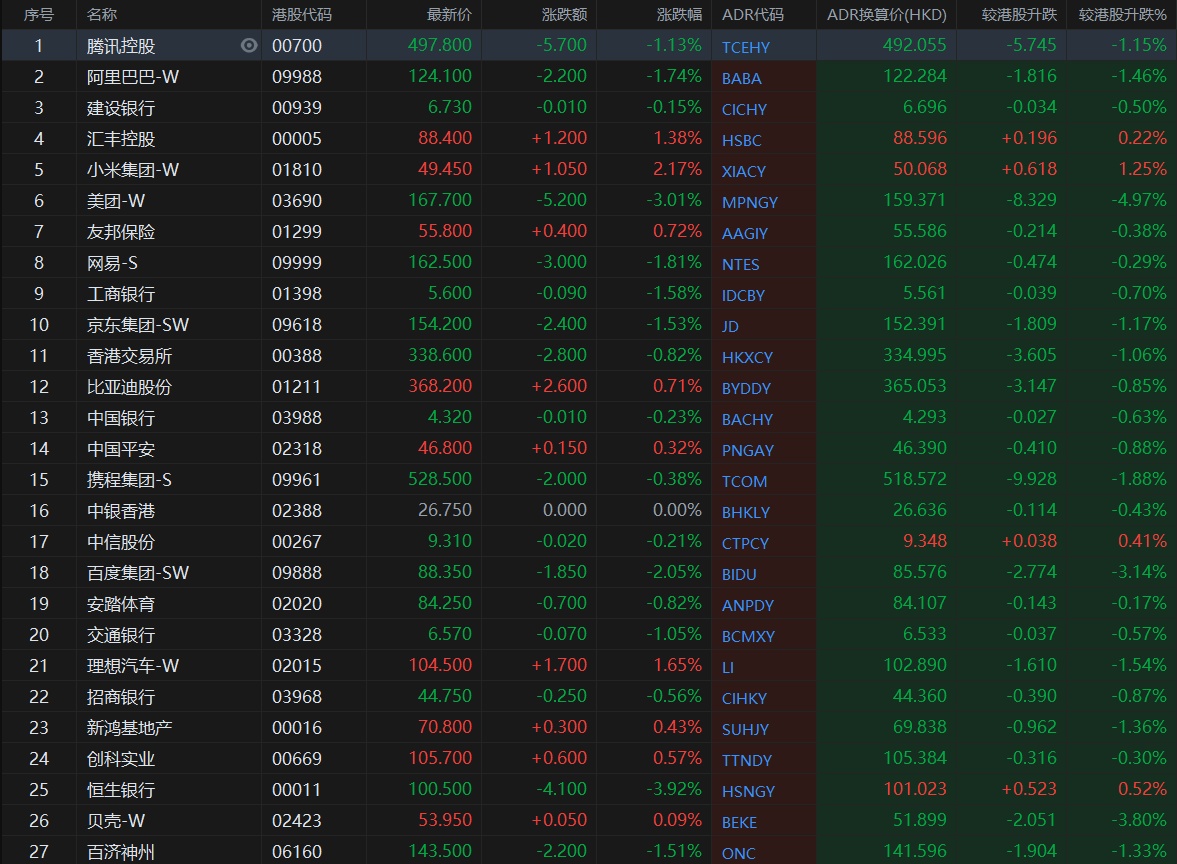大型蓝筹股多数下跌,汇丰控股收报88.596港元,较香港收市涨0.22%;腾讯控股收报492.055港元,较香港收市跌1.15%。