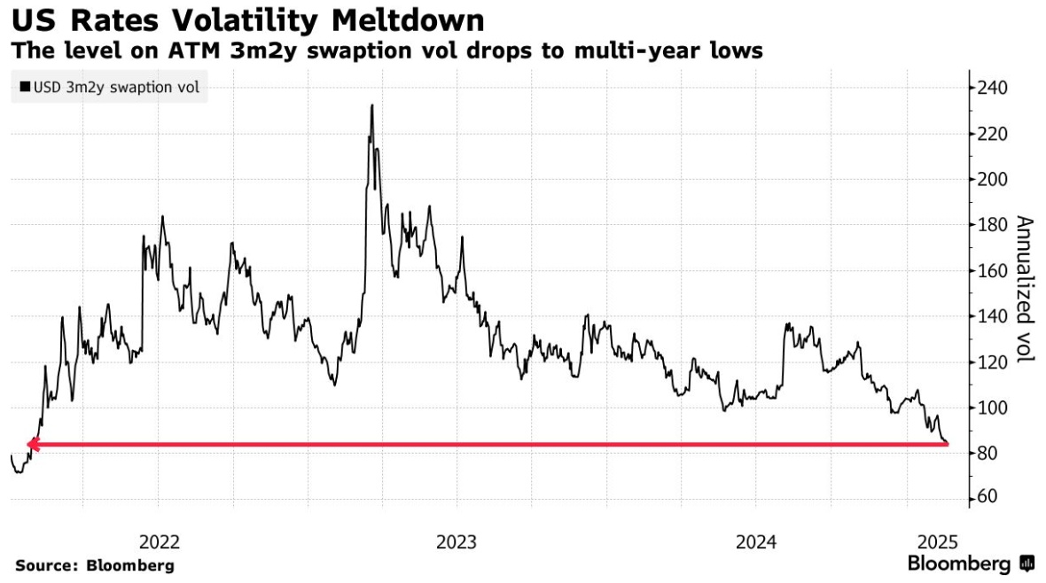 交易员放弃方向性押注,帮助美债收益率在最近几周保持窄幅区间。基准美国 10 年期国债收益率继续在 4.5% 左右徘徊,接近今年 4.38% 至 4.81% 区间的中间值。与此同时,衡量利率波动性的一个指标——3 个月/2 年期互换期权(反映期权价格的隐含波动率)已跌至 2022 年 1 月以来的最低水平。