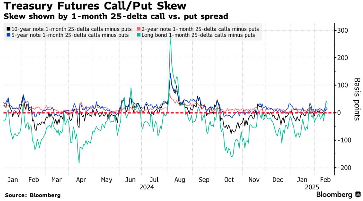 美债期权的对冲溢价已经转向有利于交易者支付对冲曲线长端上涨的溢价,目前价格已达到去年年中以来的最高水平。这是根据长期债券期货的看跌/看涨偏差得出的,过去一周,随着 30 年期债券收益率继续在 4.9% 处遇到强劲阻力,超过任何抛售的 5%,看跌/看涨偏差大幅上升。过去一周,2 年期、5 年期和 10 年期美债期权的看跌/看涨偏差保持接近中性。过去一周的资金流动包括大量对 3 月看跌期权中 10 年期债券看跌走势的获利回吐。周三的突出交易包括一家大型看涨期权买家,目标是 10 年期债券收益率跌破 4.52%。