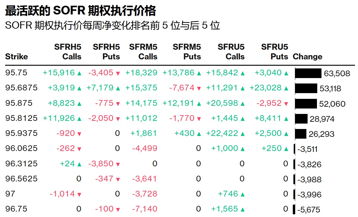 过去一周,由于SOFR Mar25 95.75/95.815/95.875 看涨期权、SOFR Jun25 96.00/95.875/95.75 看跌期权和 SOFR Jun25 95.75/95.8125/95.875 看涨期权等新仓位的出现,95.75 行权价的未平仓合约数量大幅增加。过去一周,由于对 Jun25 95.6875/95.875看涨期权价差和 Jun25 95.6875/97.00看涨期权价差等流动的兴趣,95.6875 行权价的成交量也十分可观。过去一周,H5、M5 和 U5 期限的仓位清算数量有限。