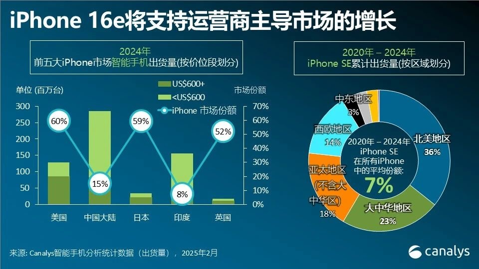 通过入门级计划加强与运营商的合作伙伴关系,能够提高iPhone 16e的实惠性并促进其普及。历史上,iPhone SE在运营商促销中发挥了重要作用,作为入门级合约计划的高性价比选择,iPhone 16e有望进一步强化这一角色。Canalys的数据显示,苹果在2024年的运营商渠道出货量占总出货量的25%,这凸显了与电信运营商保持强大合作关系的重要性。通过借助运营商促销,苹果能够最大化iPhone 16e的覆盖范围和价格竞争力,进一步巩固其市场地位。