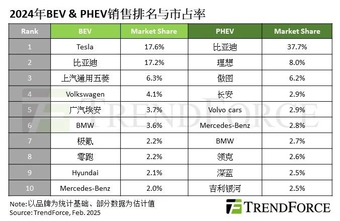 PHEV部分,第一名的比亚迪品牌市占率约38%,若加计集团内其他品牌则超过40%。第二至四名分别为理想、傲图和长安(含启源),其中,傲图因问界M9带动其总销量大幅提升,进入年度市占前十大榜单。BMW的PHEV销量较去年小幅下降3%,位居第七名,其BEV和PHEV的销量差距持续扩大。吉利集团的自主品牌领克和吉利银河也是新上榜,分别为第八和第十名。吉利集团2024年整合旗下品牌,包括几何汽车并入吉利银河,领克和极氪合并为极氪科技集团,但仍维持领克和极氪双品牌发展。