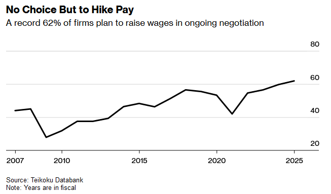 智通财经APP获悉,最新出炉的一项调查结果为日本央行进一步加息的前景提供了支持。根据日本市场研究公司Teikoku Databank的一项调查,在接受调查的1.1万家日本企业中,由于企业们正在努力招聘和留住员工,约有61.9%的受访企业计划在企业新财年提高员工工资,这一比例是有史以来最高的。此外,约56%的受访企业表示,计划提高基本工资,这一比例也是Teikoku Databank自2007年开始追踪这一问题以来的最高水平。