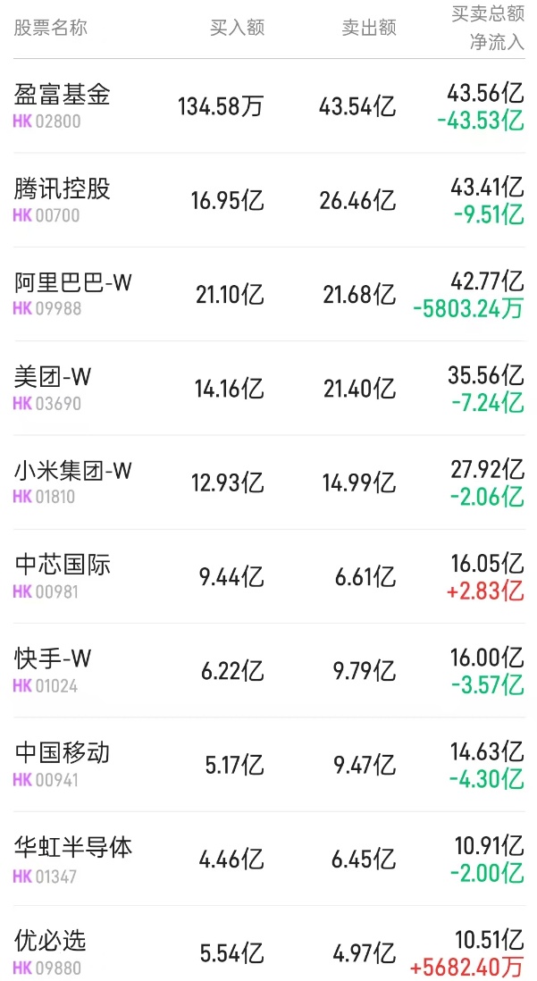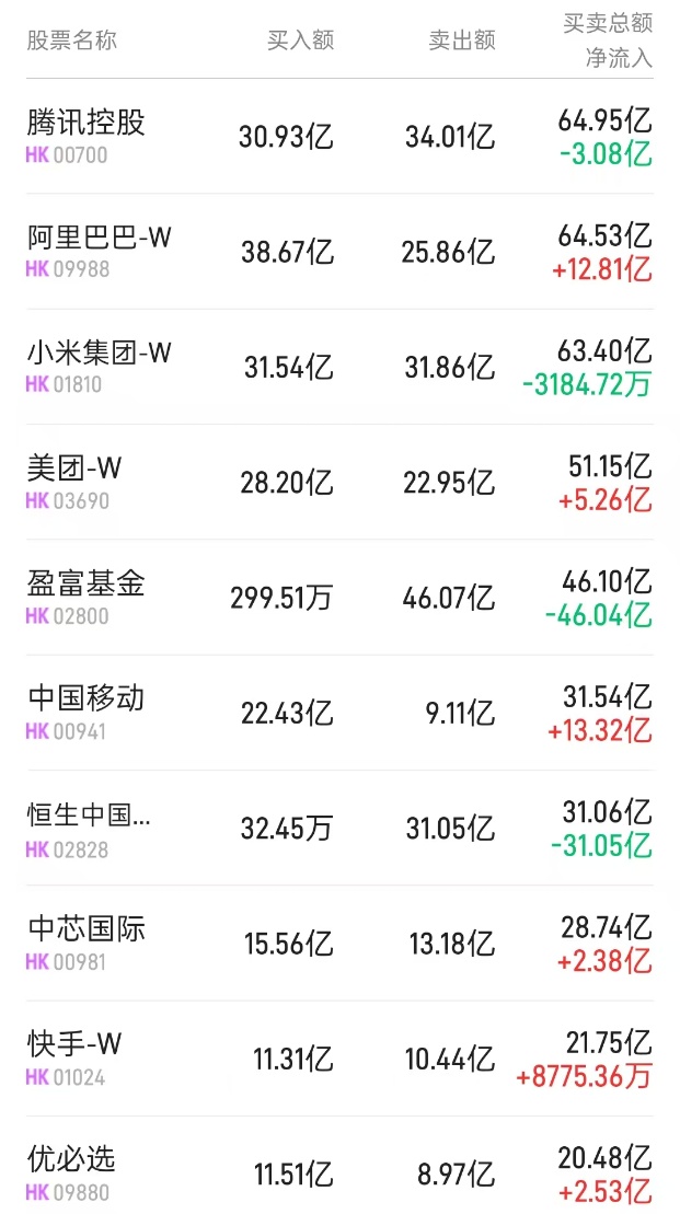 北水净买入最多的个股是阿里巴巴-W(09988)、中国移动(00941)、中芯国际(00981)。北水净卖出最多的个股是盈富基金(02800)、恒生中国企业(02828)、腾讯(00700)。