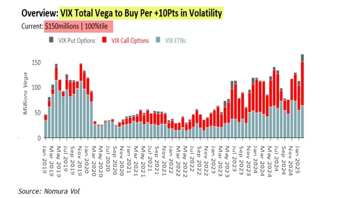 Charlie McElligott表示,这意味着交易员正在为美国股市可能出现的波动率坍缩(Volatility Squeeze)做准备,为更大规模的去风险事件埋下伏笔。尽管市场尚未出现极端波动,但他将当前头寸分布称为一次“假设性但令人不安的压力测试”,模拟了波动率突然飙升可能引发的连锁反应。他表示:“如果VIX指数在接近3月到期日时反弹,做市商和对冲机构将被迫买入VIX指数期货以维持对冲,波动率指数的波动性可能再次飙升。”