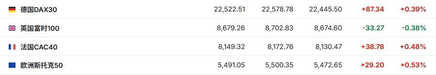 2. 截至发稿,德国DAX指数涨0.39%,英国富时100指数跌0.38%,法国CAC40指数涨0.48%,欧洲斯托克50指数涨0.53%。