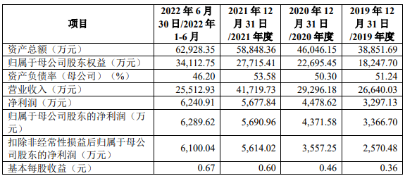 财务方面,2019年、2020年、2021年及2022年1-6月,该公司实现营业收入分别约为人民币2.66亿元、2.93亿元、4.17亿元、2.55亿元,同期净利润分别约为3297.13万元、4478.62万元、5677.84万元、6240.91万元。