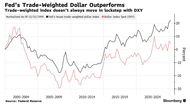 比安科认为,这种观点与新上任的美国财政部长斯科特·贝森特周四在接受采访时所强调的“美国仍坚持强势美元政策"的表态并不矛盾。因为特朗普领导下的美国政府可能将寻求降低贸易加权美元汇率(这是一种衡量美元对全球主要贸易伙伴货币价值的指标)以缩减贸易逆差,而金融指标美元指数(比如彭博美元现货指数等)可能同步走强——这一衡量所谓“金融美元”的指数自特朗普11月胜选以来已上涨2.3%。