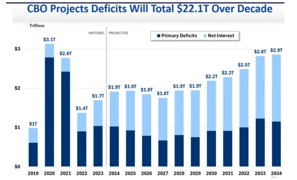 2024财年美国政府净利息支出已经高达8820亿美元,利息支出增速达创纪录的34%,是预算中第三大支出项目,仅次于社会保障和医疗保健,在2024财年甚至超过国防开支。根据美国国会预算办公室(CBO)的预测,预算赤字在2034财年将大幅扩张至2.9万亿美元,以及2025-2034财年累计预算赤字高达22万亿美元;CBO还预测净利息支出2025财年将再创历史新高,逼近1万亿美元,占GDP的 3.4%,超1991年创下的3.2%这一历史纪录;预计到2034财年净利息支出达到近 1.7 万亿美元,占GDP的4.1%。