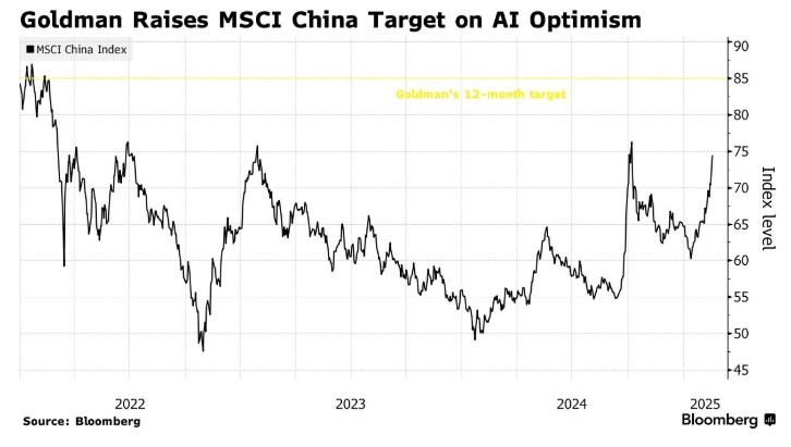 华尔街大行高盛在经历“DeepSeek冲击波”重创美股科技巨头之后,展现出该机构对于中国股市的看涨热情。高盛研究部的中国股票研究团队预计,未来十年AI的广泛普及有望推动中国股票整体盈利每年提高2.5%,高盛还将MSCI中国指数以及沪深300指数目标点位分别上调至85点及4700点,意味着两指数在未来12个月分别有大约15%及20%的上涨空间。在AI为中国经济增长前景赋予更多希望的同时,高盛团队也指出强有力的政策刺激同样将是推动股市持续上涨、跨越宏观环境挑战不可或缺的动能。