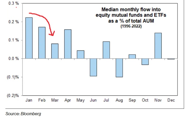 今年以创纪录速度涌入美股的散户需求,预计将在三月纳税季前大幅放缓。养老金资金流也可能“后继乏力”甚至大幅流出,鲁布纳将此趋势归因于季节性市场规律——通常每年1-2月是资产配置最活跃时期,3月资金流入往往减弱。