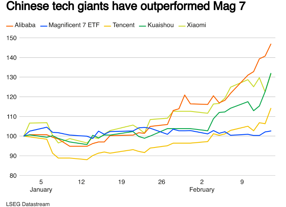 随着中国本土人工智能初创公司DeepSeek全面崛起,并且引领以“低成本”和“高能效”为核心的全新“AI大模型算力范式”,DeepSeek开始与医疗、金融和教育等各行各业,以及与消费电子等AI应用终端深度融合带来的AI创新产品/服务,有望带动中国半导体、SaaS软件、云计算乃至所有行业的销售额和营业利润步入新的增长范式,推动全球投资者们对于中国股票的看涨热情,尤其是对于大幅受益推理端算力需求的巨头们——即具备强大云端AI算力体系的阿里巴巴和腾讯等云巨头的看涨情绪在这一周进一步加剧。