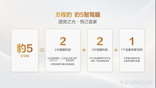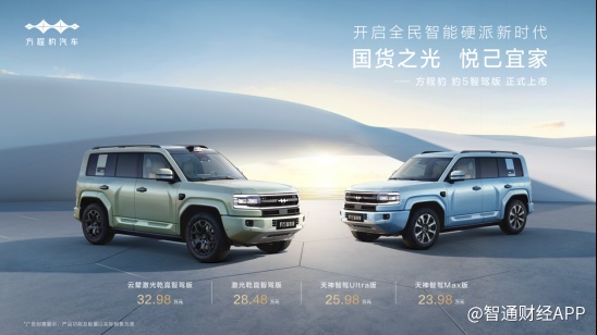 随着比亚迪(01211)2月10日智能化战略的发布,2月21日,旗下新能源个性品牌方程豹也紧跟步伐,带来了豹5智驾版的正式上市,开启全民智能硬派新时代!这是继豹8之后,方程豹带来的又一款超级混动智能硬派SUV。豹5智驾版是目前全球唯一兼具比亚迪“天神之眼”、华为“乾崑智驾”两大高阶智驾系统的车型。同时,它还融合了DMO电驱越野开创平台、云辇-P百万液压悬架系统以及硬派专属AI智能座舱等顶尖科技于一身,实现了“电驱可城又可野,智驾全国都能开”,让智驾变得更有趣。豹5智驾版此次共发布了4大版本,包括天神智驾Max版、天神智驾Ultra版、激光乾崑智驾版、云辇激光乾崑智驾版,价格区间为23.98万元-32.98万元。