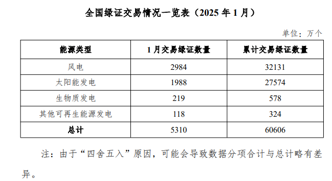2025年1月,全国交易绿证5310万个,其中绿色电力交易绿证2596万个。截至2025年1月底,全国累计交易绿证6.06亿个,其中绿色电力交易绿证2.64亿个。