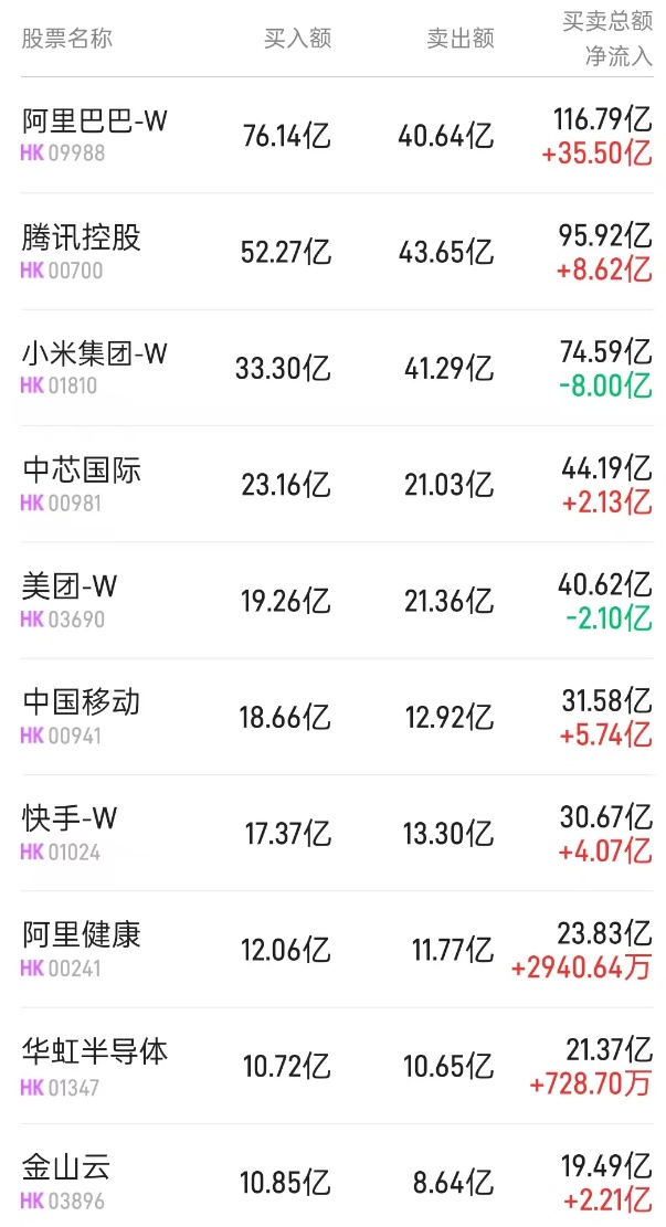 此外,美团-W(03690)、阿里健康(00241)分别获净买入3.5亿、2940万港元。