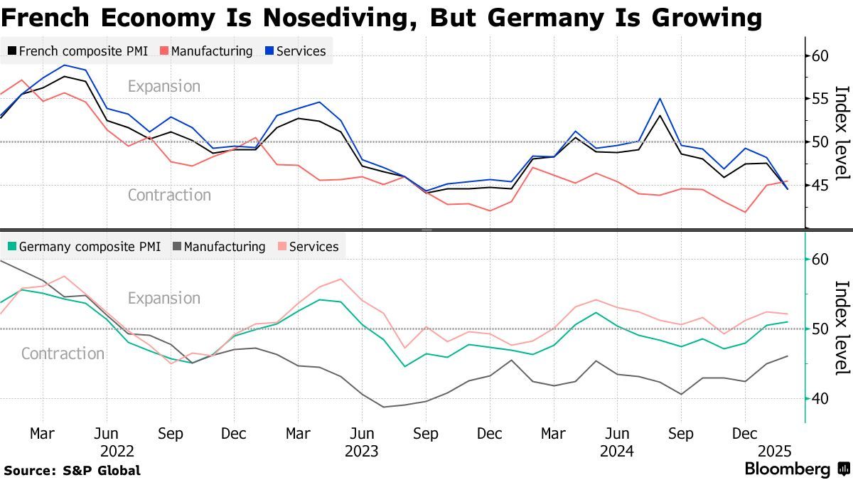 相比之下,法国的经济前景令人担忧。数据显示,法国2月SPGI综合PMI初值为44.5,低于前值47.6和经济学家预期的48。其中,服务业PMI初值和制造业PMI初值均位于荣枯线以下。