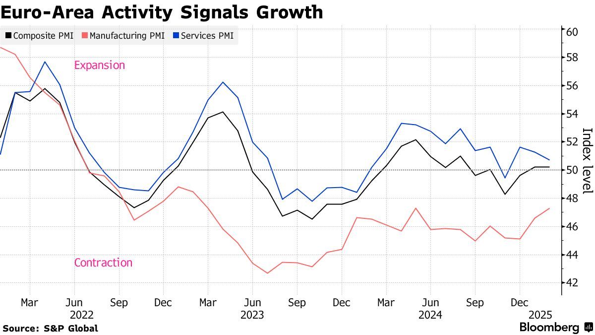 在周日的选举到来之前,德国经济似乎展现出好转的迹象,人们希望可能成为下一任总理的保守派Friedrich Merz能够减少繁文缛节、重振投资。数据显示,德国2月SPGI综合PMI初值升至51,高于前值50.5和经济学家预期的50.8。