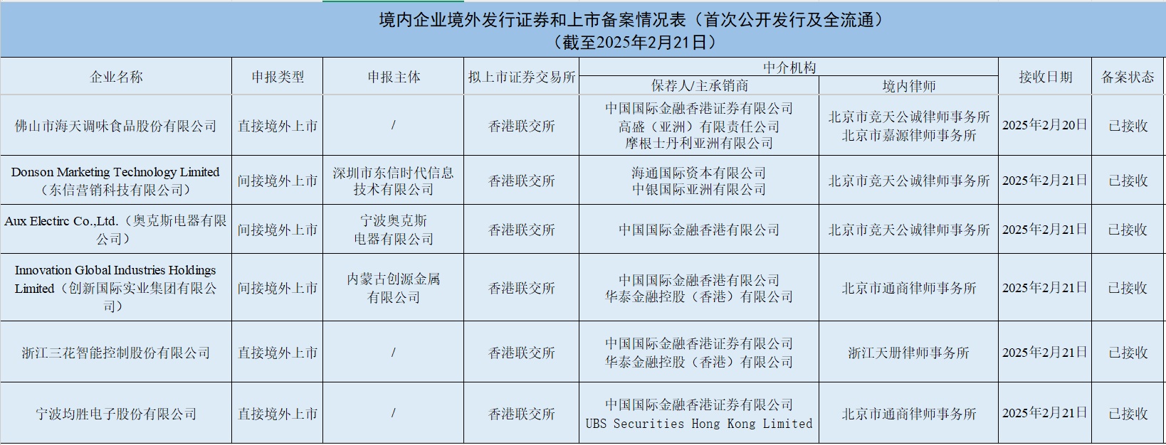智通财经APP获悉,2月21日,中国证监会发布《境内企业境外发行证券和上市备案情况表(首次公开发行及全流通)(截至2025年2月21日)》。本周(2月17日-21日),海天味业(603288.SH)、东信营销科技、奥克斯、创新国际、三花智控(002050.SZ)、均胜电子(600699.SH)港股IPO备案申请材料获中国证监会接收。