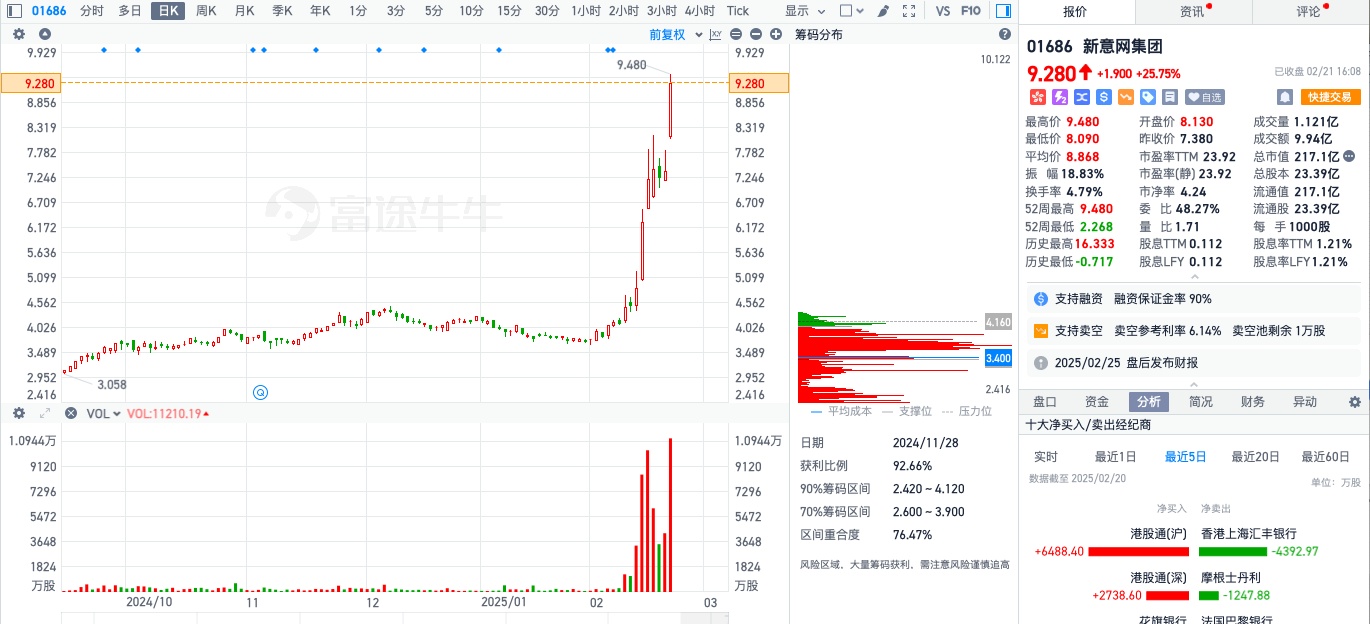 自2月14日以来,新意网集团(01686)就吸引了港股投资者的注意,在多个交易日盘中强势拉升,不到10个交易日已实现股价翻倍。截至2月21日收盘,新意网集团股价报9.28港元,增幅达25.75%,成交量高达1.12亿股,总市值达到217.1亿港元。值得关注的是,该股月内涨幅高达147.5%,股价表现堪称惊艳。