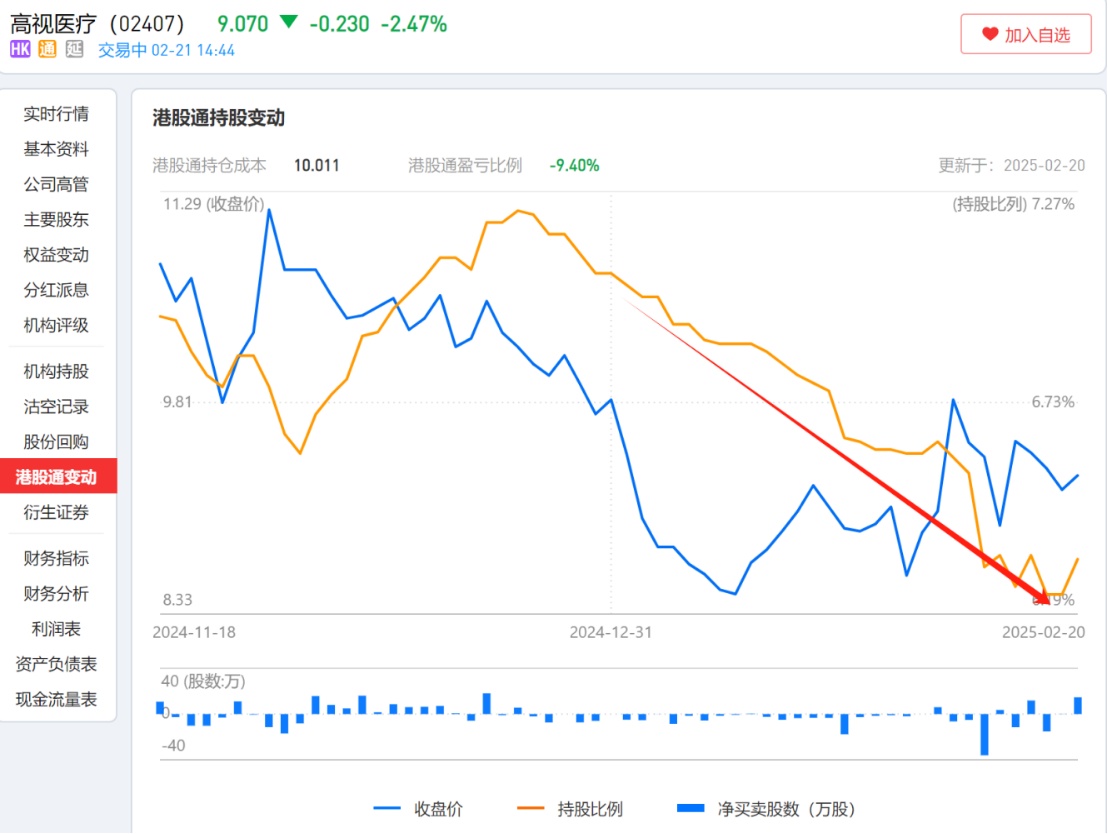 实际上,高视医疗股价在12月19日后仍在一路走低,这波下行行情持续到了今年1月13日,但港股通资金并未按此前“越跌越买”的策略持续增持而是转为不断减持,即使后续高视医疗股价出现震荡反弹,港股通资金的减持趋势也未停止。截至2月20日,高视医疗的港股通持股比例已降至6.33%。