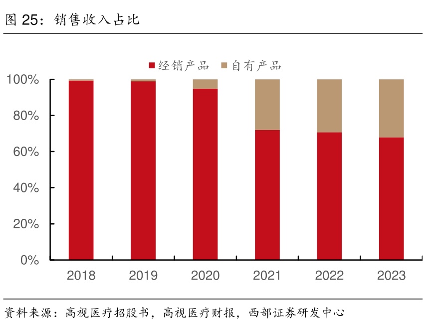 不难看出,高视医疗其实已有意识主动对业务结构进行调整:去经销产品,提升自有产品比重。但2023年,其自有产品收入比重仍未达到40%。